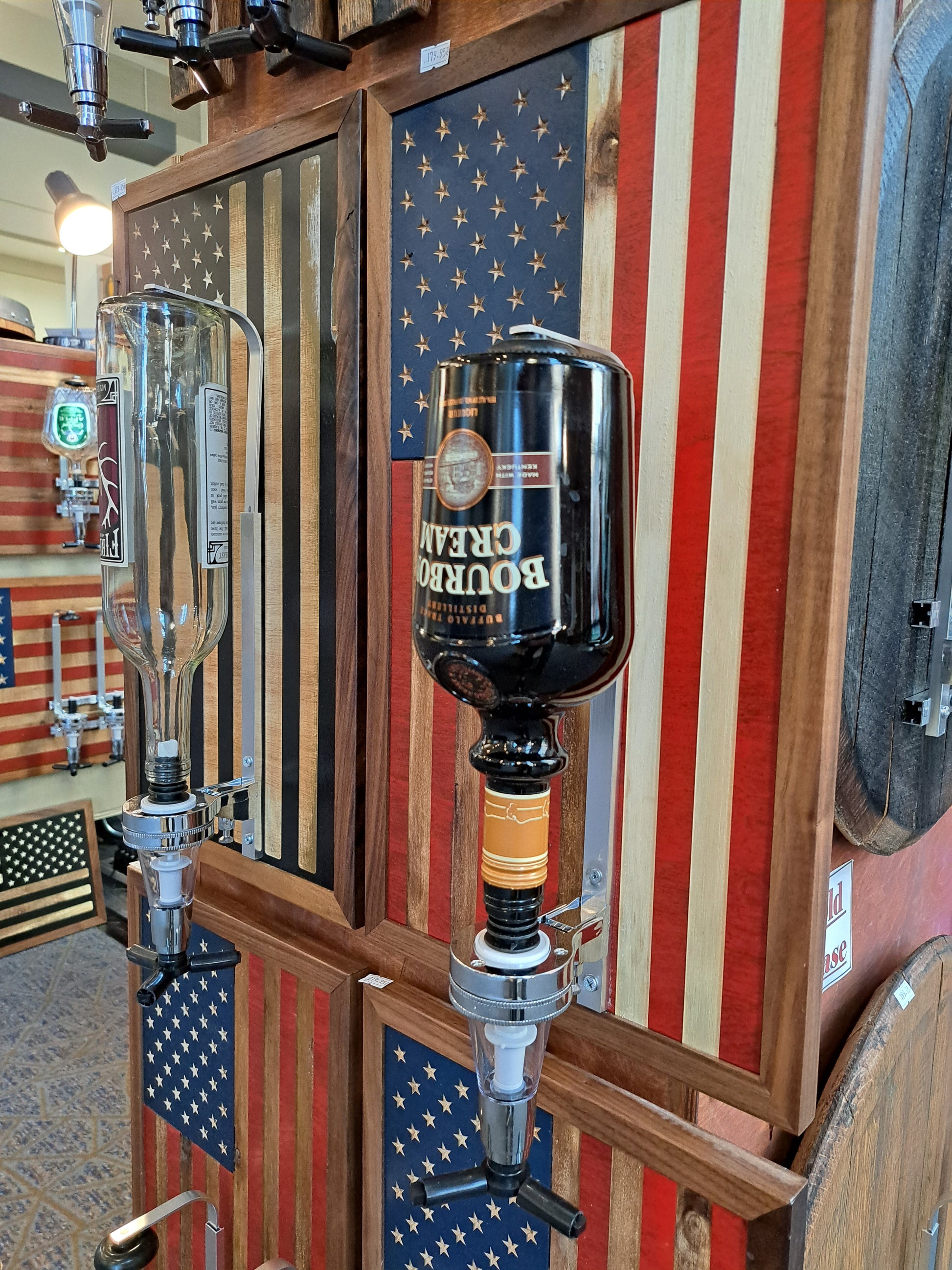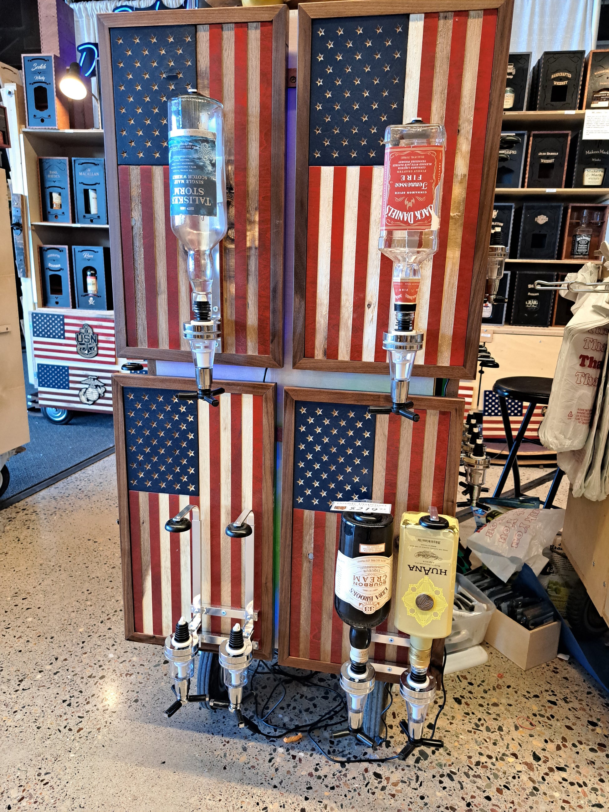 This stunning addition to your bar is sure to impress! Each Vertical flag is made from birch and wrapped with black walnut. Dim the Lights and plug in the included LED lights for another level of WOW!, Watch, as the flag starts to glow on the wall, then your friends will realize that its also a working liquor dispenser. This amazing dispenser has the perfect measured shot ready for you anytime. once you fill you glass from the reservoir it will reload another shot, beckoning you for more. Heaven on the wall!
