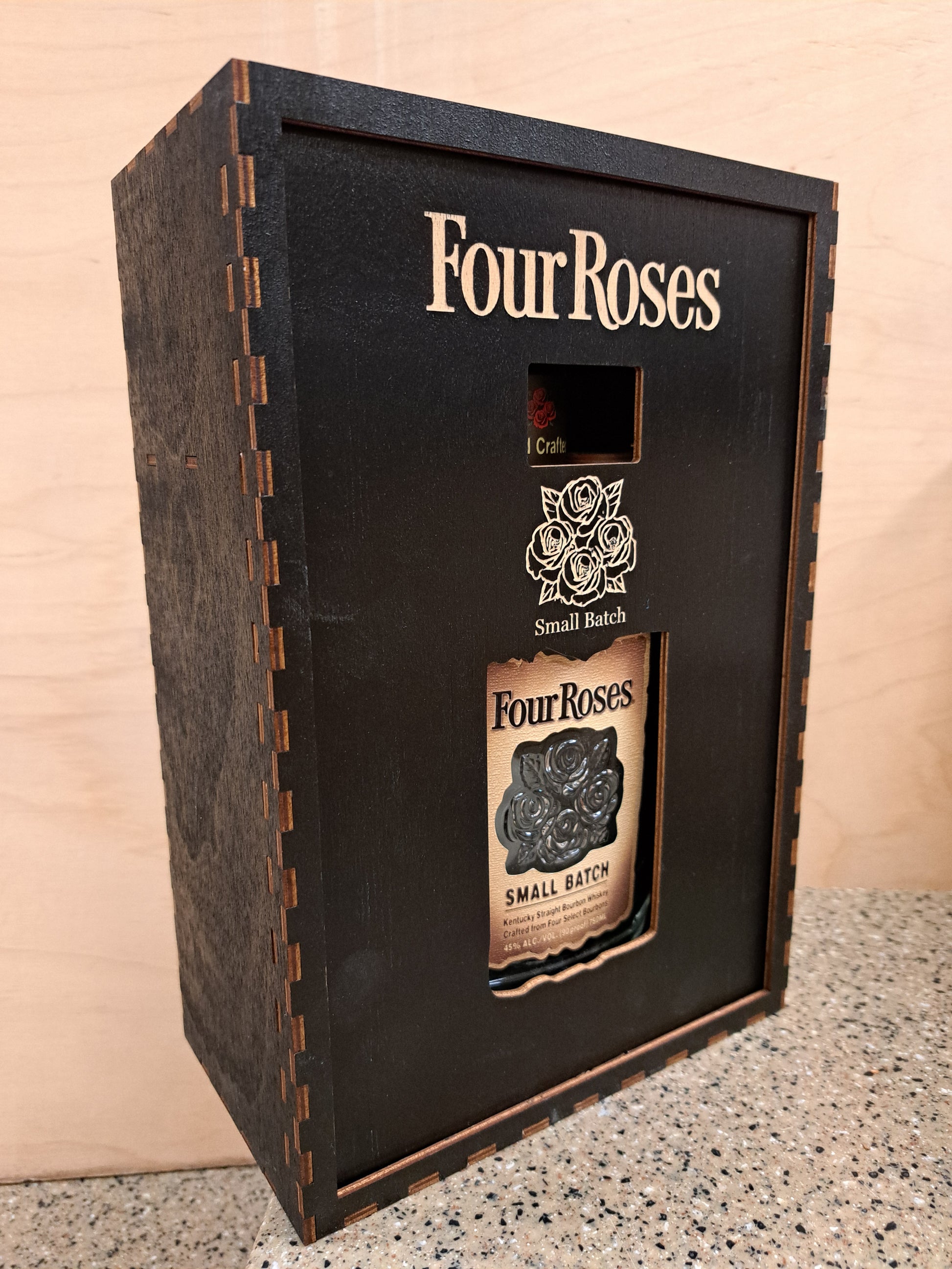 Display and store your favorite Whiskey in this eye-catching, handmade, wooden box that features precision laser cut joinery, hand rubbed stain and a furniture grade clearcoat. This will definitely be the center of attention in your bar. Give the gift that lasts long after the last drop has been poured!